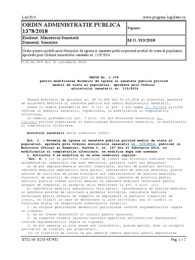 Ministerul s ordinul nr.119 din 04.02.2014 pentru aprobarea normelor de igienă şi sănătate publică privind mediul de viaţă al populaţiei act emis de: Anexa se modifică şi se înlocuieşte cu anexa care face parte integrantă din prezentul ordin. 33/2009 privind organizarea şi funcńionarea ministerului dezvoltării regionale şi locuinńei, cu modificările ulterioare, ministrul dezvoltării regionale şi locuinńei emite următorul ordin