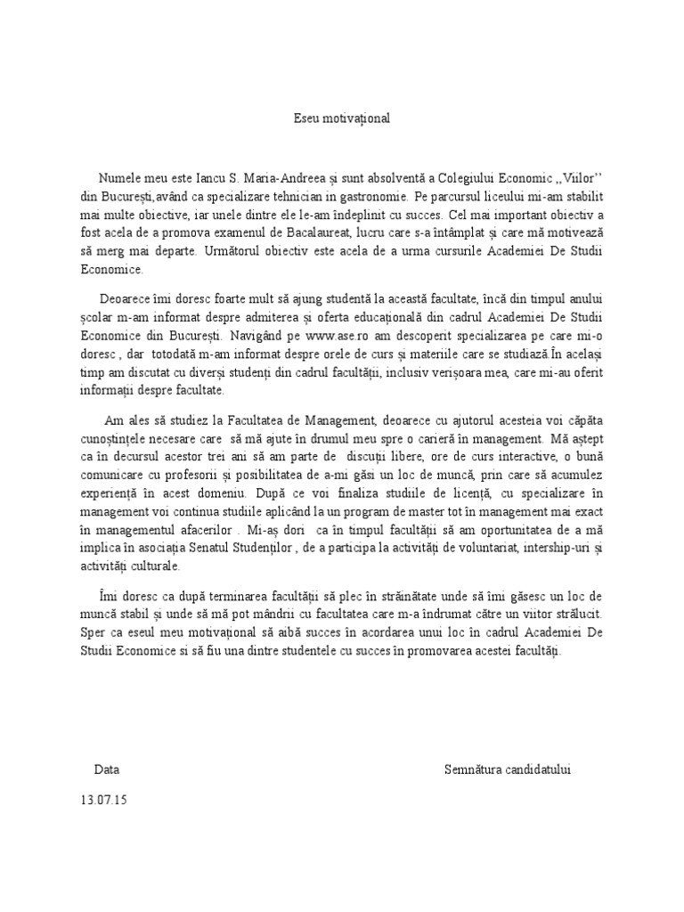 Eseu motivational mai jos o sa aveti mai multe rezultate pentru cautarea eseu motivational. Andreea,sunt absolventă a colegiului naţional,, alexandru vlahuţă din râmnicul sărat,jud.buzău în anul curent şi doresc să candidez ca student la facultatea de sociologie şi asistenţă socială din cadrul universitatii din bucuresti pentru a studia în.